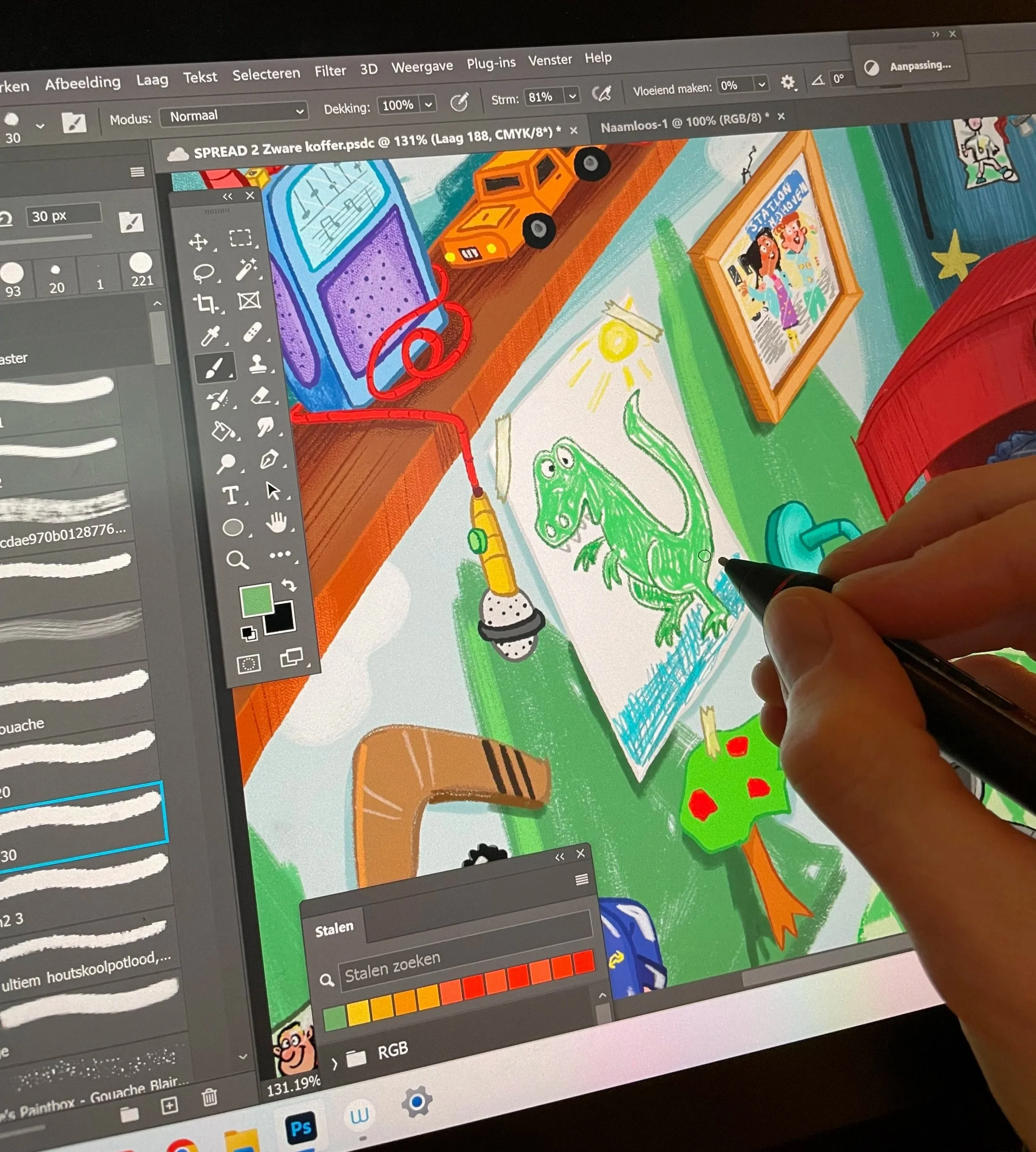 Eva made her illustration debut in 2017 with Dikke Vik en Vieze Lies worden vrienden by Sunna Borghuis — winner of the Hotze de Roos Prize. Since then, she’s illustrated three more books in the series, her own seek-and-find book Kosmo’s Space Journey, and numerous other projects including Amsterdam Animal Madness and The Train Journey of Tommie and Tess — complete with a illustrated locomotive and model train.